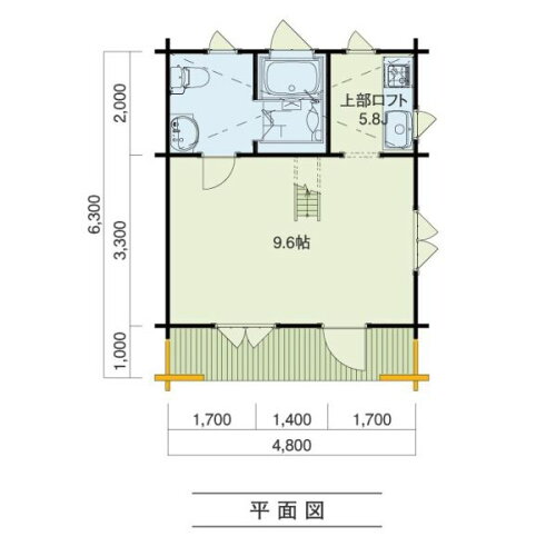 Model date ・M-062:バロB ・室内高さ:2,234mm から 4,394mm ・1F床面積:25.44m2(7.69坪) ・ロフト床面積:9.60m2(2.90坪) ・延床面積:35.04m2(10.59坪) ・ベランダ面積:4.80m2(1.45坪) ・建築面積:30.24m2(9.14坪) ・総面積:39.84m2(12.05坪) ミニログハウスキット「バロB」仕様書 ログ壁 ログ厚70mm(レッドパイン材、建具開口加工済) 通しボルト 鋼鉄製ペグ ※1 木製ダボ 造作壁 間柱 仕上用平板 カバーボード(セトリング用) 床 根太 根太受 大引 巾木 床板[28mm] ロフト 床板 根太 根太受 巾木 木製ハシゴ(幅/550mm) 屋根 ログ棟木 母屋 桁 垂木 垂木固定用スライド金物 野地板(天井板兼用) 破風板(波型破風スペア付き) 鼻隠板 面戸板 廻り縁 軒先用水切板金 屋根材(アスファルトシングル) ベランダ ログ手摺 手摺補強板 床板(防腐処理圧力注入材) 根太(防腐処理圧力注入材) 根太受(防腐処理圧力注入材) 大引 建具 玄関ドア(2重ガラス入木製ドア) 窓(2重ガラス入り木製窓、あおり止め付) カバーボード 霧除けセット ※浴室ドアはキットには含みません ※2 金物類 ログ組補助ツール 各種釘 建具把手類 ドア用鍵、シリンダー その他 図面一式 日本語マニュアル ※3 備考 確認申請にはログサイズ70mm以上が適応されます。
