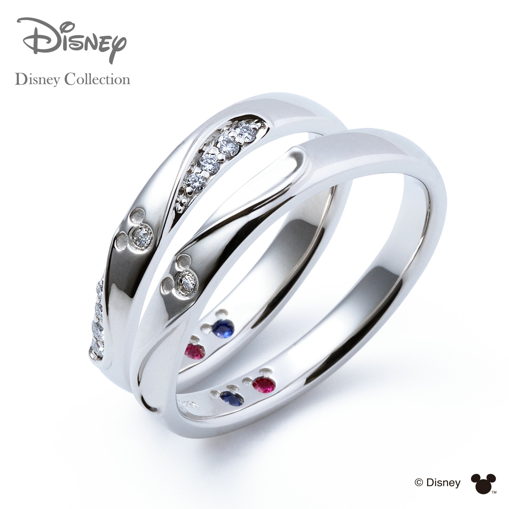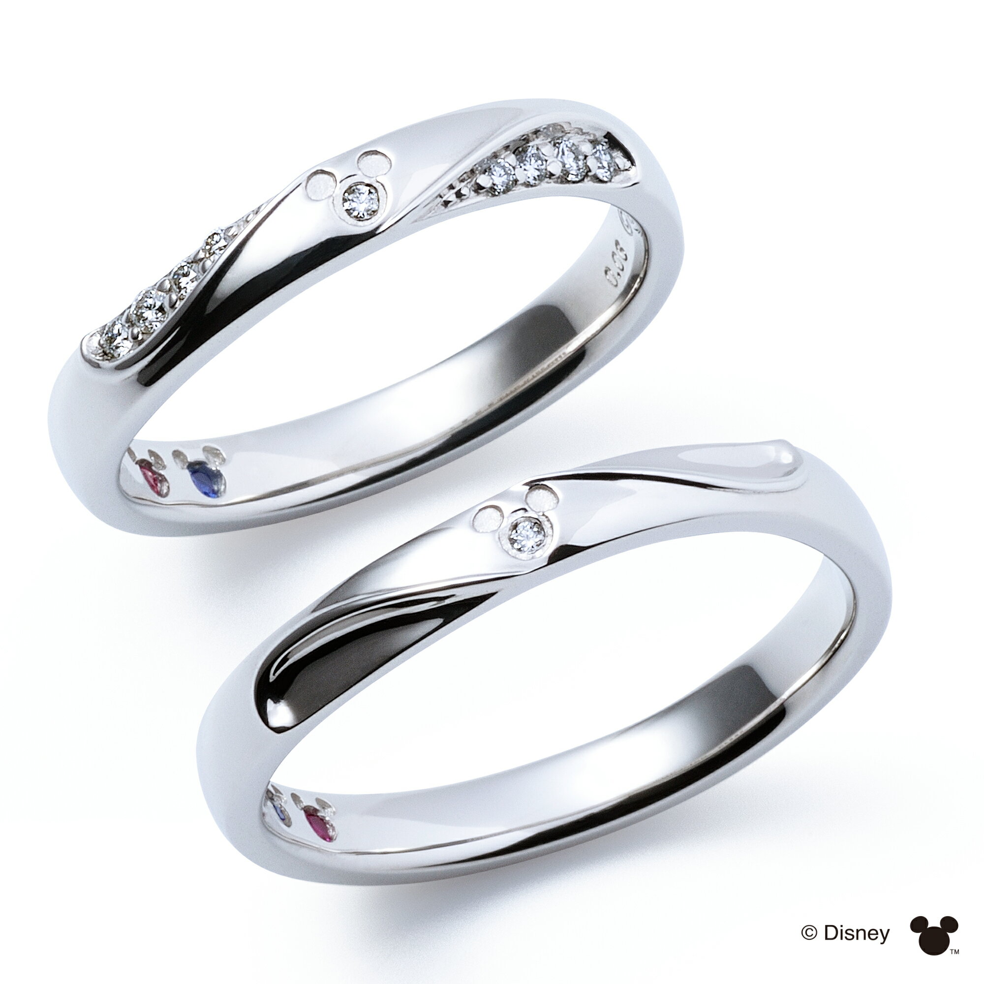 サイドにはダイヤモンド入りのミッキーのモチーフが輝き、内側のミッキーのモチーフにはお互いのバースデーストーンをセットできます。